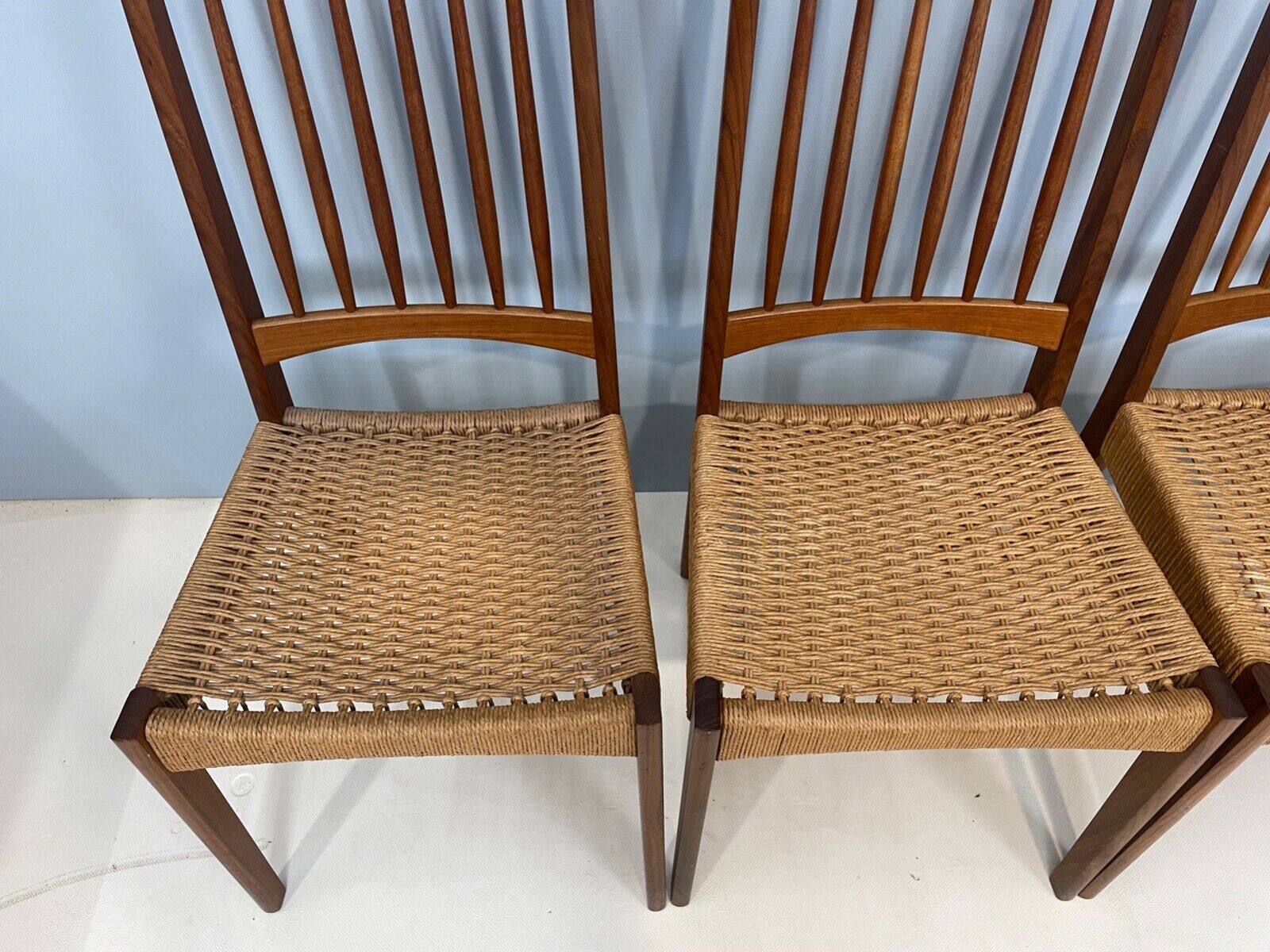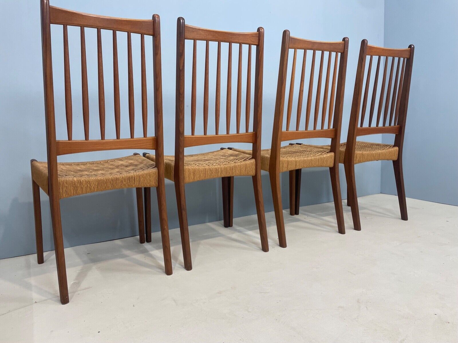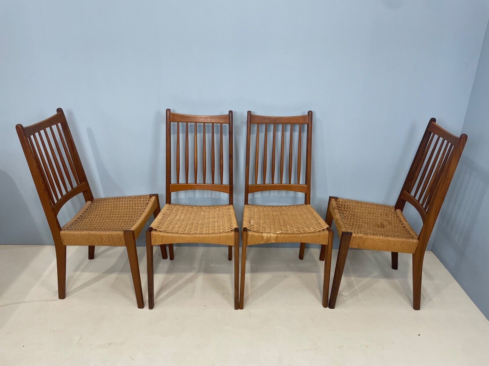 Vintage set of 4 Danish paper cord dining chairs designed by Arne Hovmand Olsen for Mogens Kold in the late 60s/early 70s.