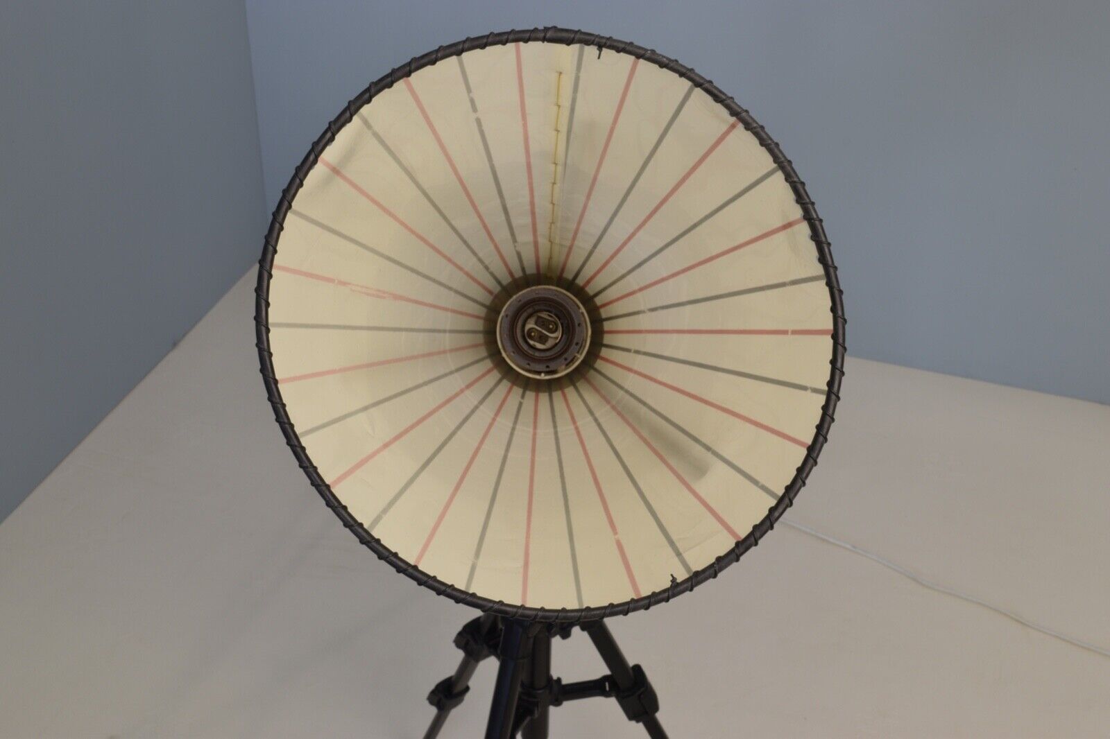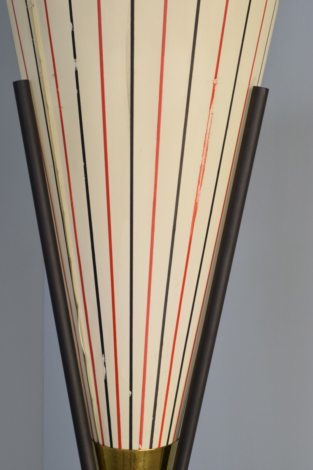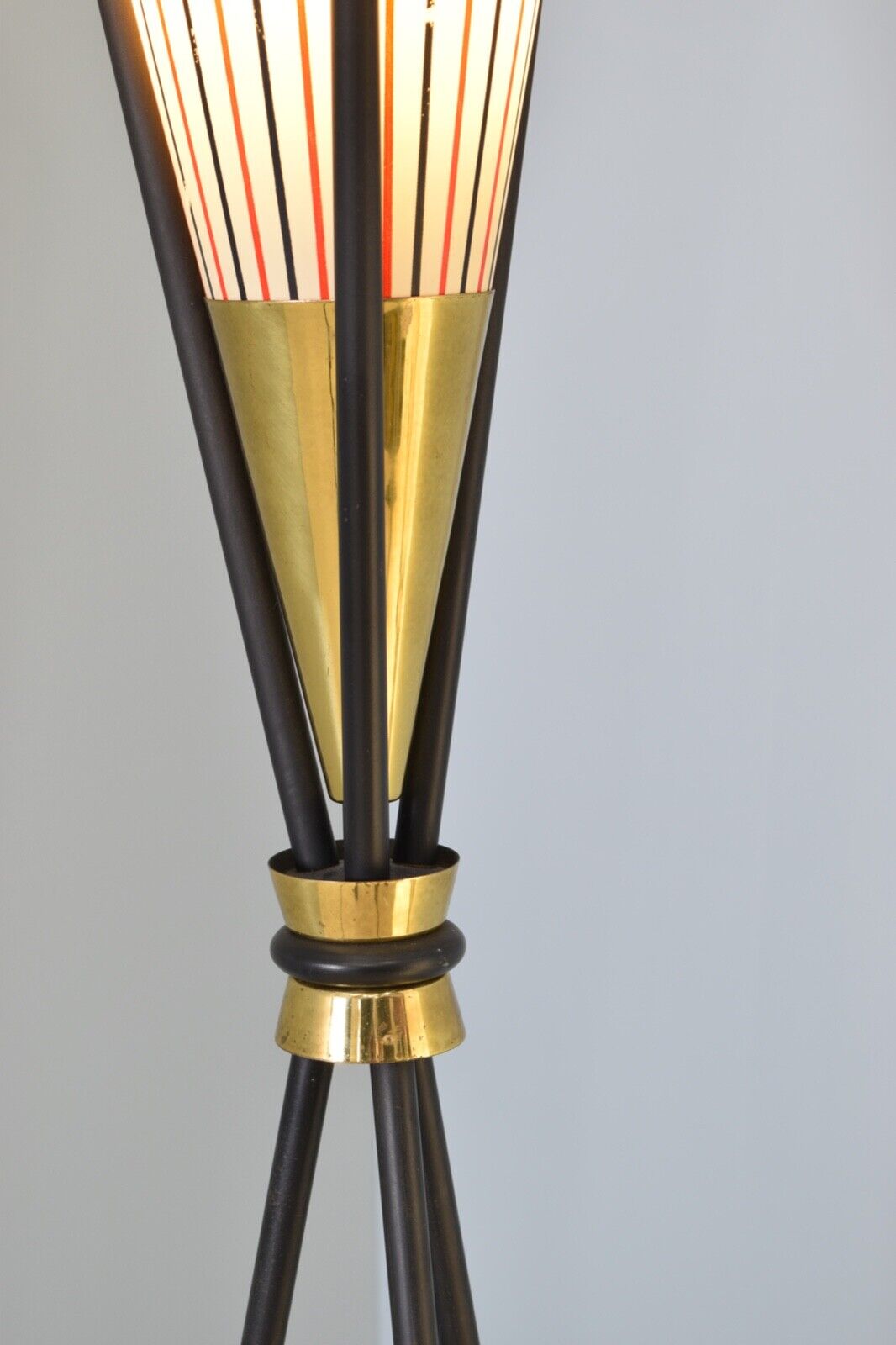 Very unusual 1950s Italian style tripod lamp, black tubular legs, brass middle and a striped conical shade.